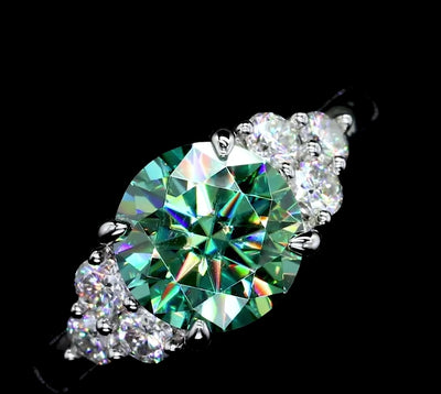 - Main Stone: Moissanite, 3ct, Blue-Green Round Cut